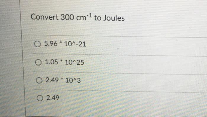 Solved 1 Convert 300 Cm To Joules O 5 96 10 21 O 1 05 Chegg Com